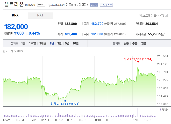- 셀트리온의 1년 주가 흐름은 4~5월 조정과 7월 이후 상승 그리고 11월 중순 최고점을 찍고 12월까지 조정이 이어지는 패턴을 보였다. 특히 5월 말부터 7월 초 반등과 10월~11월 중순의 상승 구간이 전체적인 흐름에서 중요한 상승 모멘텀으로 작용했다. 반대로 12월 말부터 5월까지의 약세와 11월 최고점 이후의 조정은 투자자 심리와 시장 환경에 따른 변동성으로 해석할 수 있다.