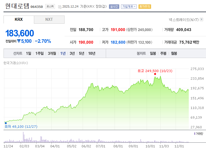 - 요컨대, 현대로템은 2025년 상반기에 강력한 상승 모멘텀을 경험하며 주가가 크게 올랐고, 10월 중순 최고점까지 도달했다. 이후 하반기에는 조정과 차익 실현이 이루어지면서 주가가 다소 하락했으나, 연말에는 일정 부분 반등세를 보여 긍정적인 흐름도 일부 이어지고 있다. 이 기간 주가 변동은 대형 방산 수주와 글로벌 시장 상황, 그리고 투자자 심리 변화가 복합적으로 영향을 끼친 결과다.