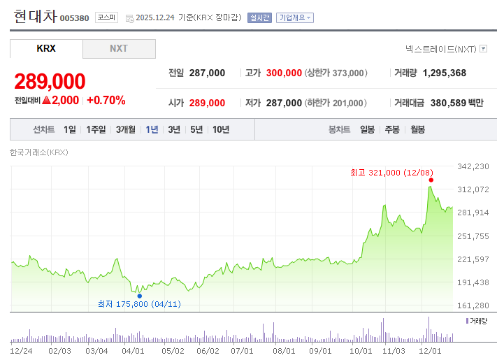 - 전체적으로 보면, 현대자동차는 연초부터 4월 중순까지 약세 조정을 겪다가 이후 4월 중순부터 12월 초까지 강한 상승세를 보였다. 12월 중순 이후에는 조정 국면을 맞으면서 상승 이전 수준보다 약간 낮은 가격대에서 주가가 유지되고 있다. 이러한 흐름은 글로벌 경제 환경과 산업 동향, 특히 전기차와 미래 모빌리티에 대한 기대감이 주가 변동을 주도한 특징을 보여준다.